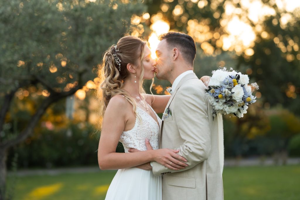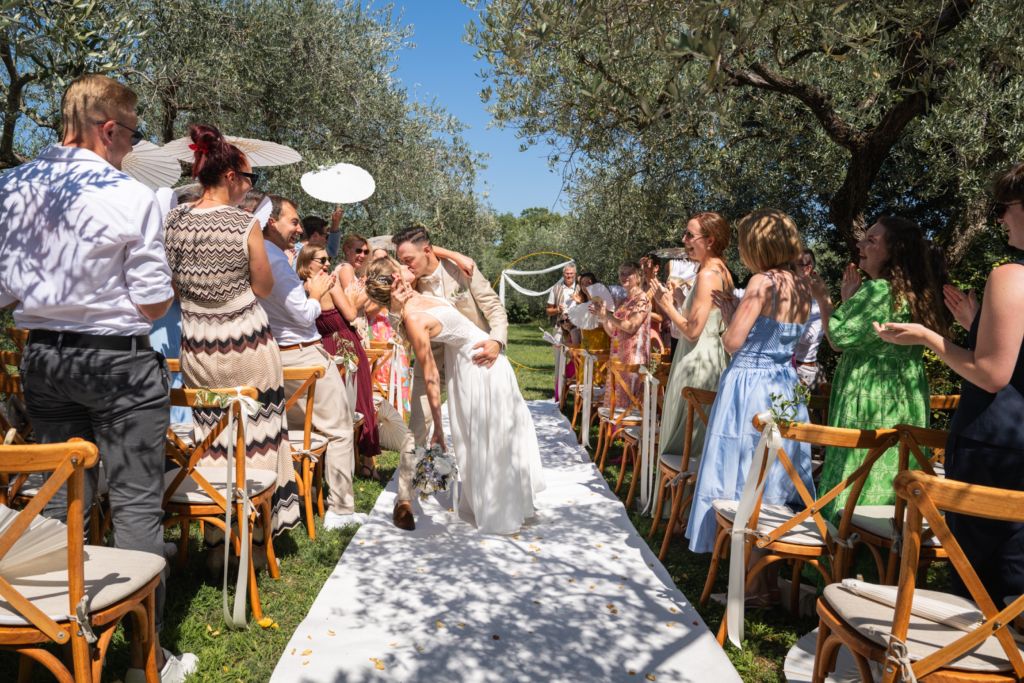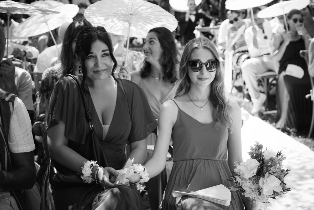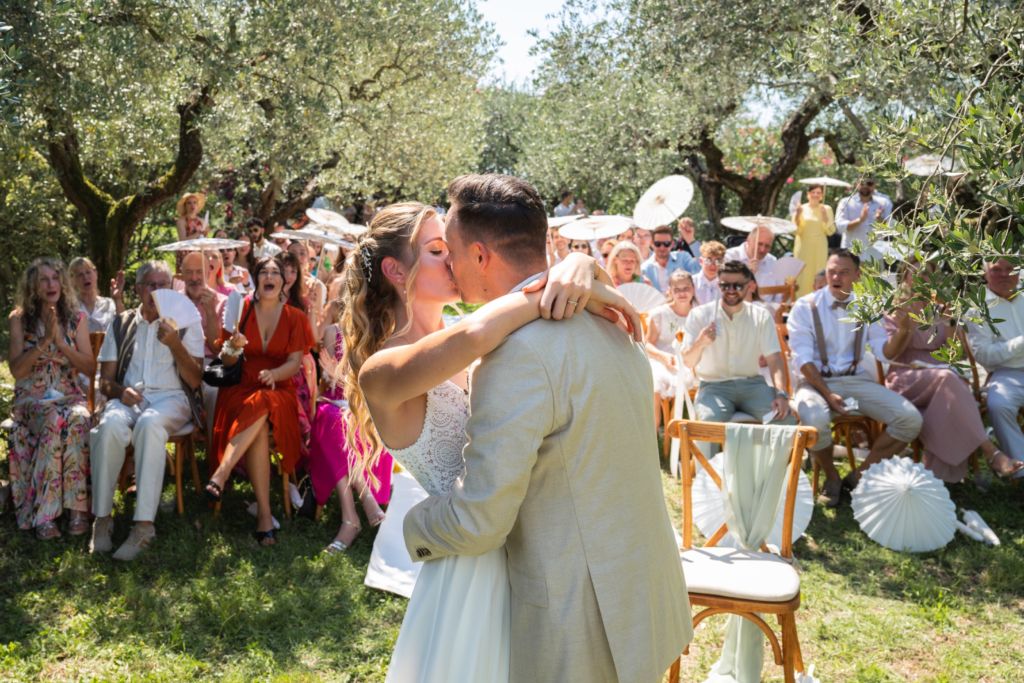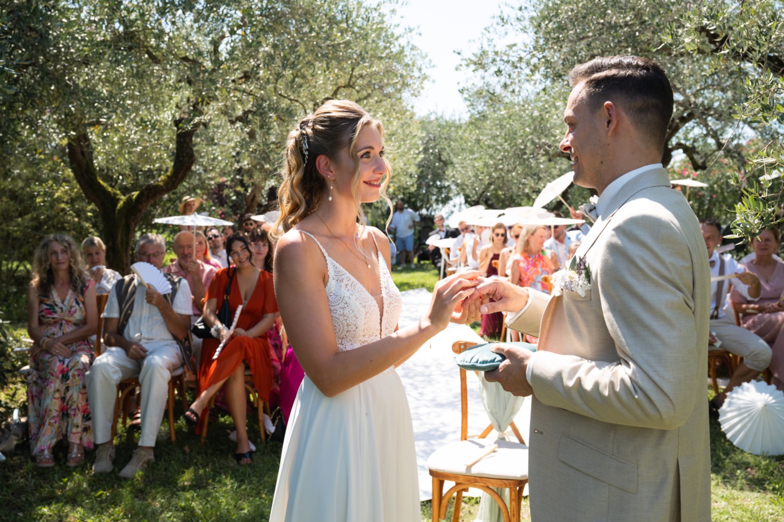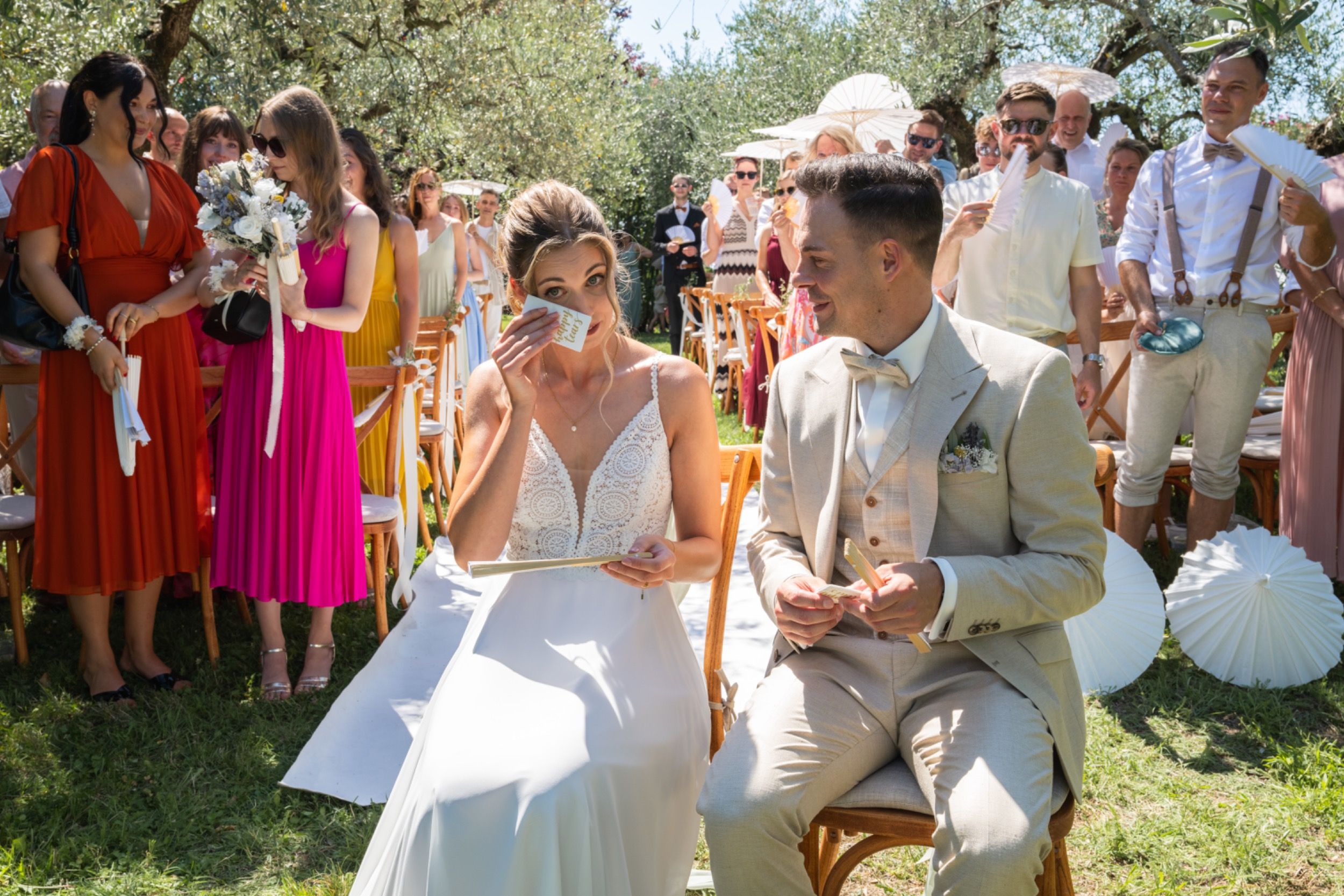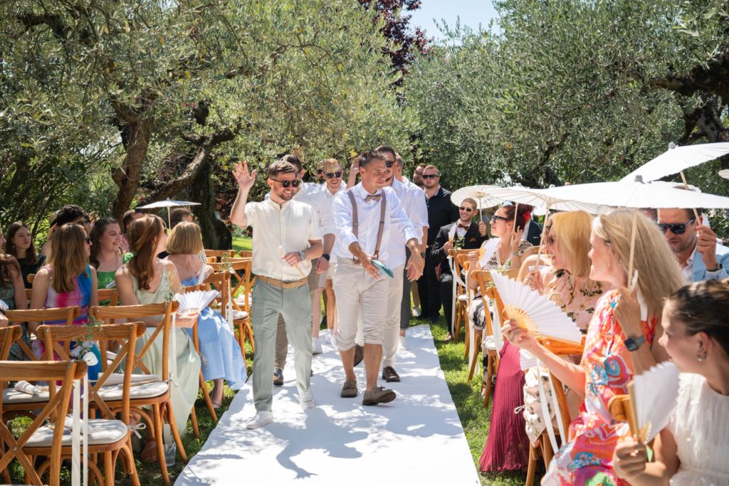 Nach dem Ankleiden ging es hinaus zur freien Trauung – und viel wärmer hätte es an diesem Tag wohl kaum sein können. Zum Glück hatte die Hochzeitsplanerin vorgesorgt: Auf allen Plätzen lagen kleine Sonnenschirmchen und Fächer bereit, die für eine willkommene Abkühlung sorgten.