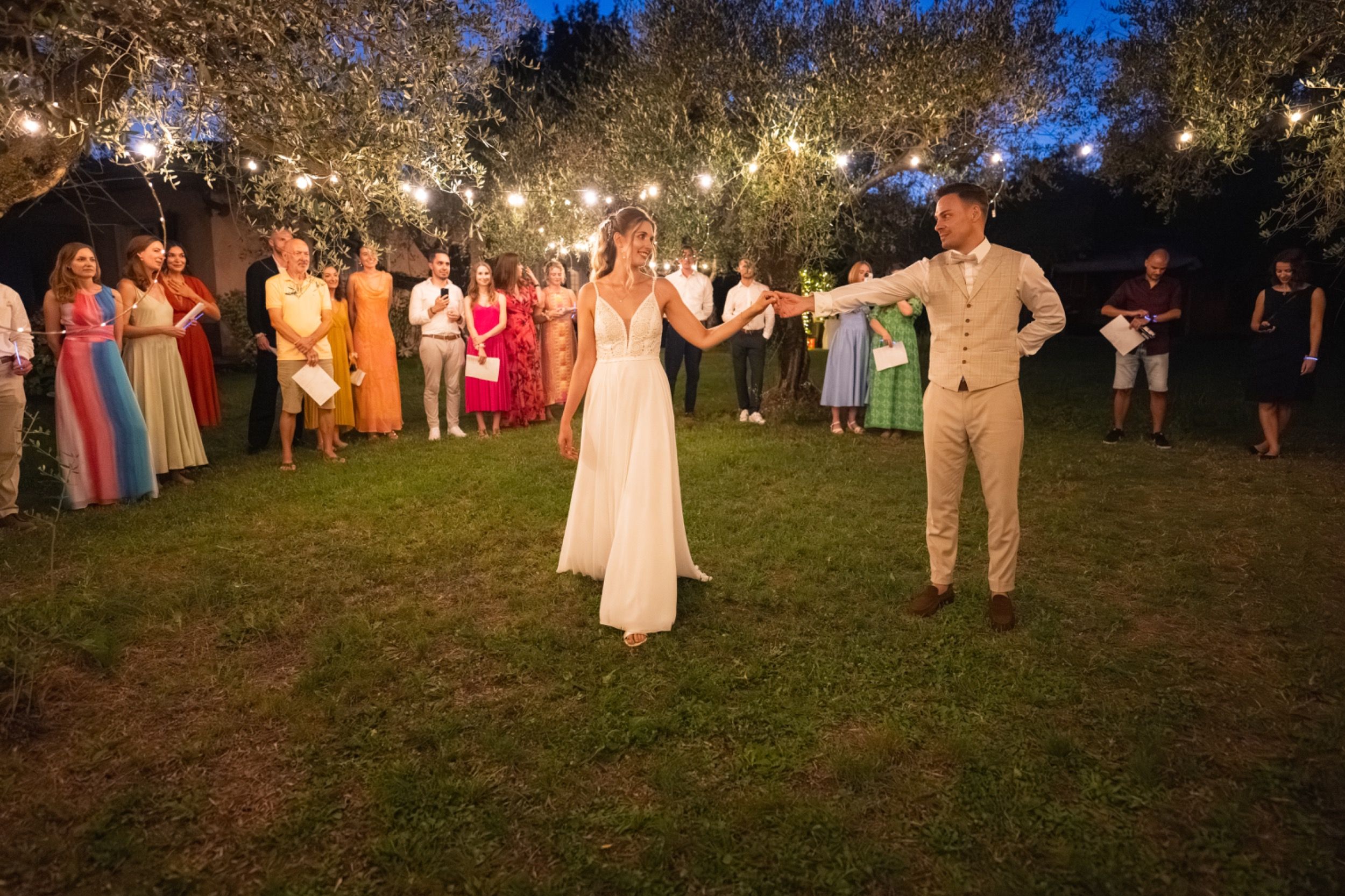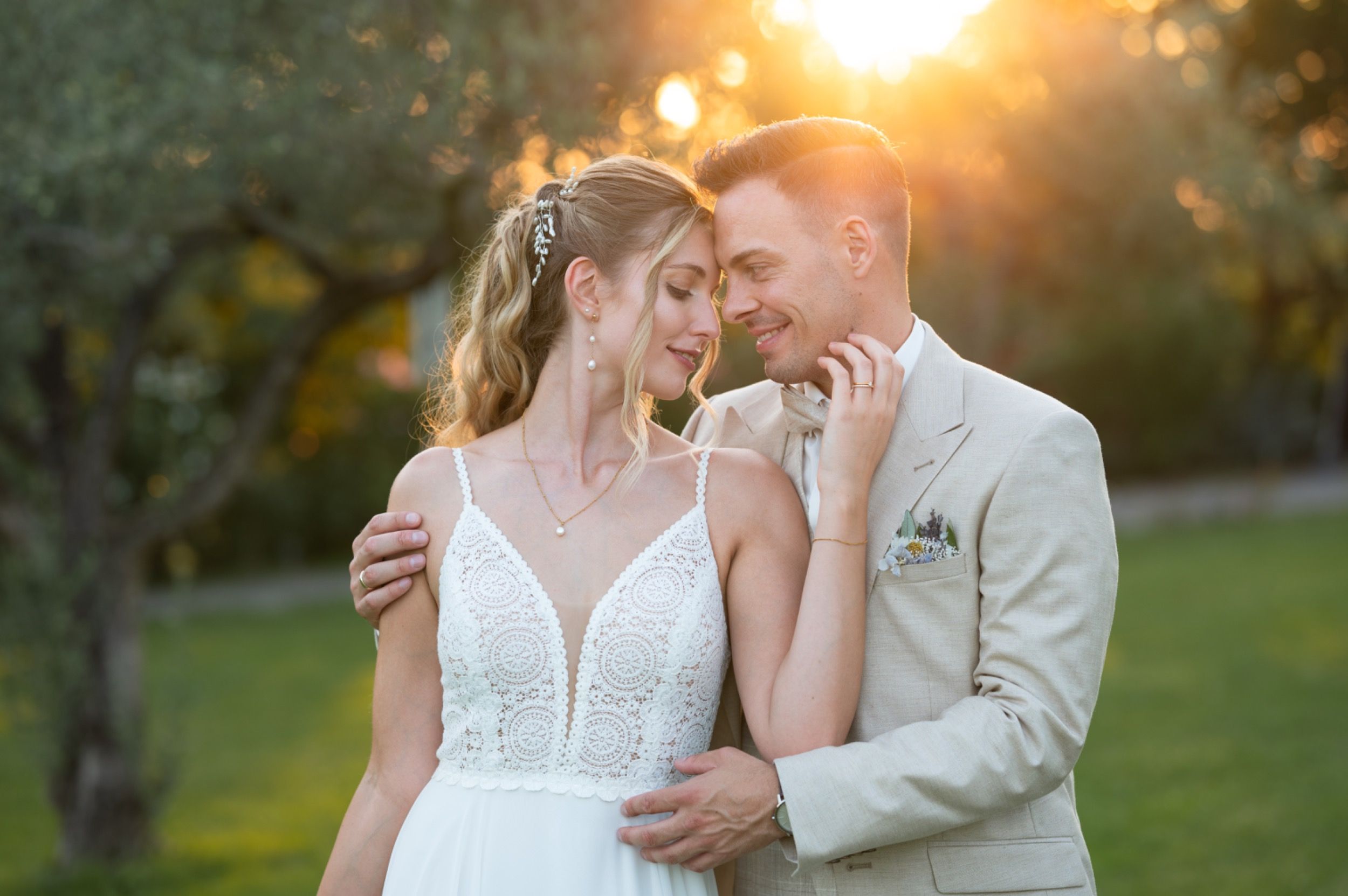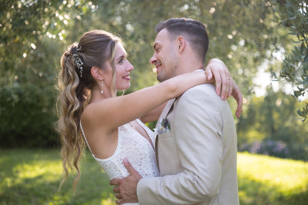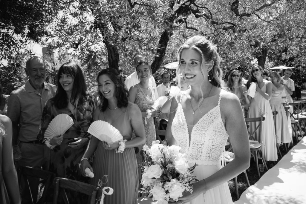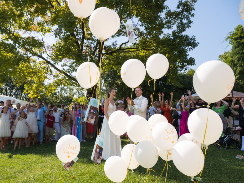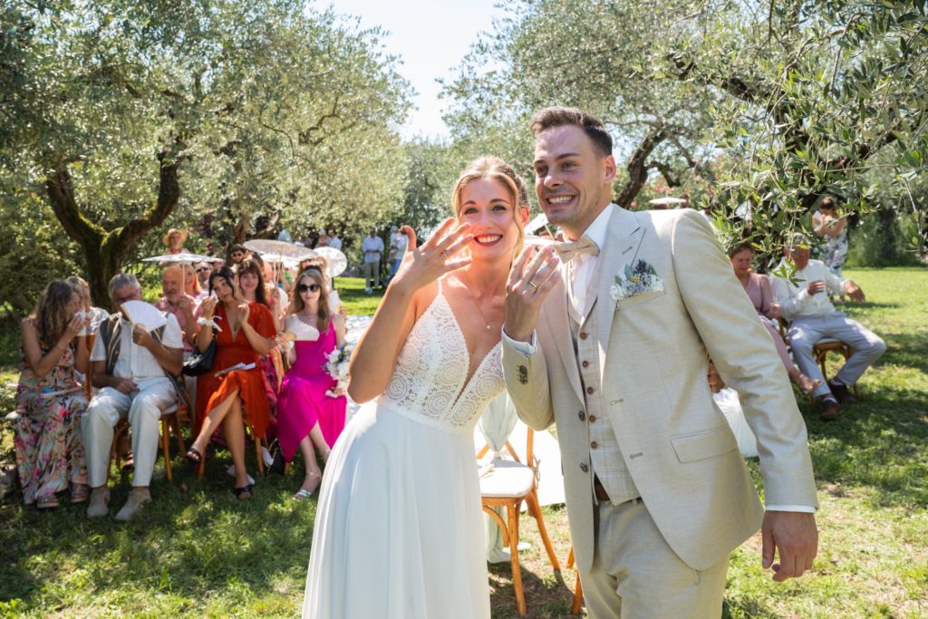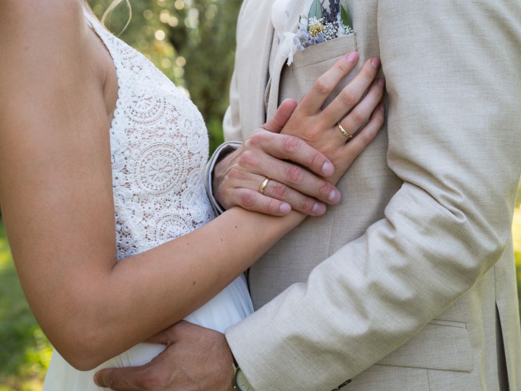 Nach dem Ankleiden ging es hinaus zur freien Trauung – und viel wärmer hätte es an diesem Tag wohl kaum sein können. Zum Glück hatte die Hochzeitsplanerin vorgesorgt: Auf allen Plätzen lagen kleine Sonnenschirmchen und Fächer bereit, die für eine willkommene Abkühlung sorgten.