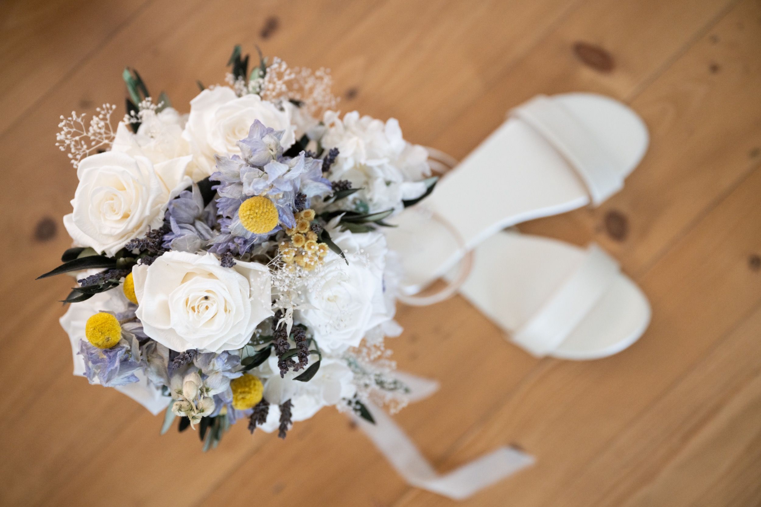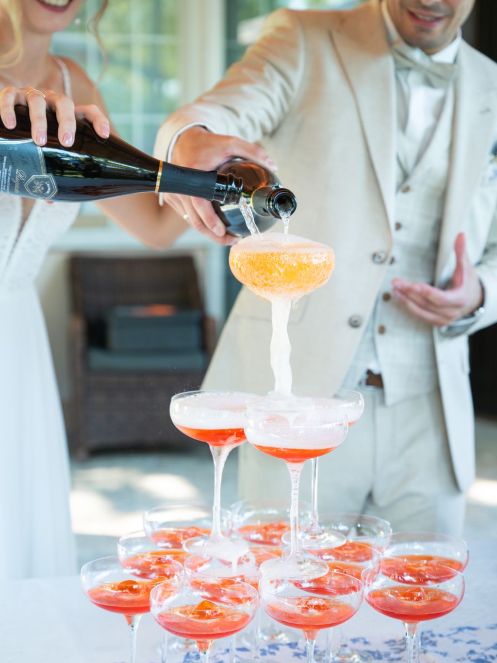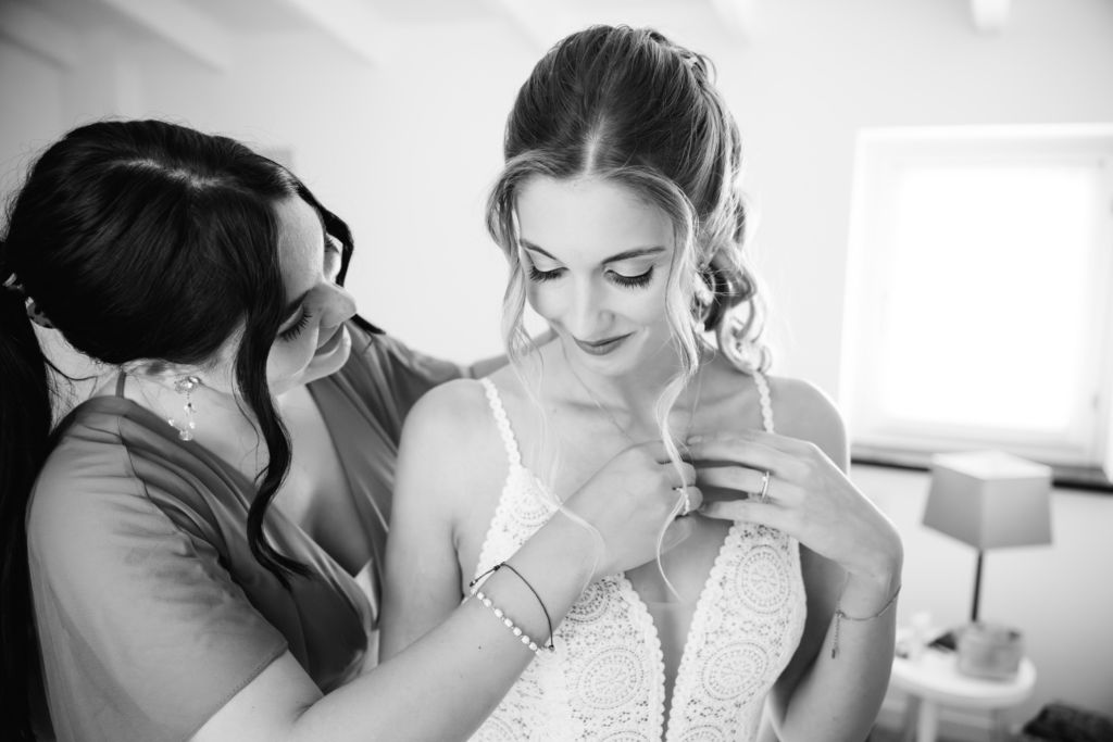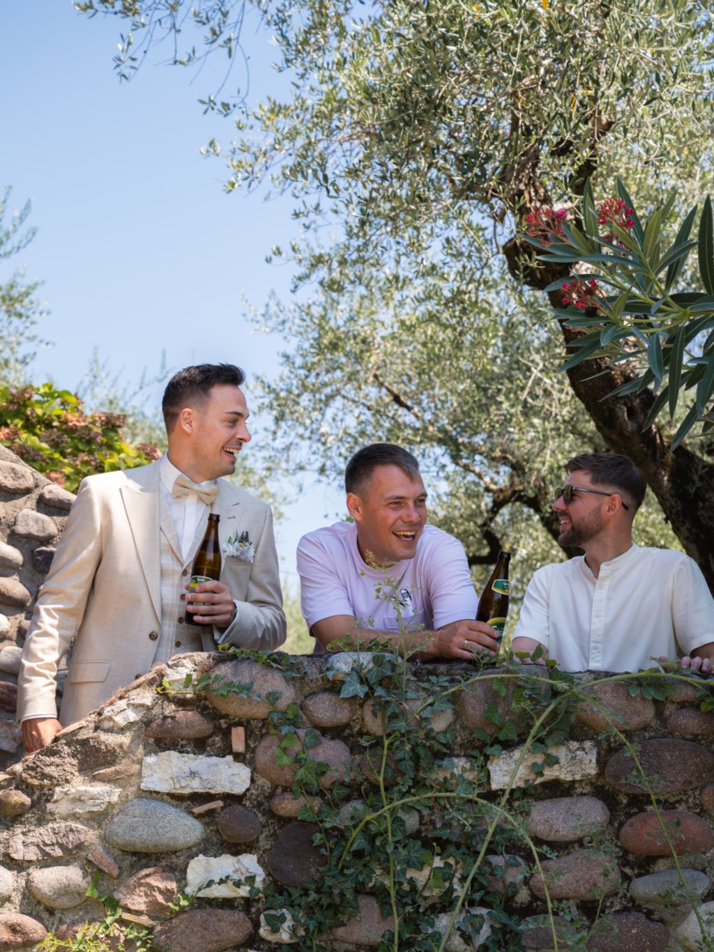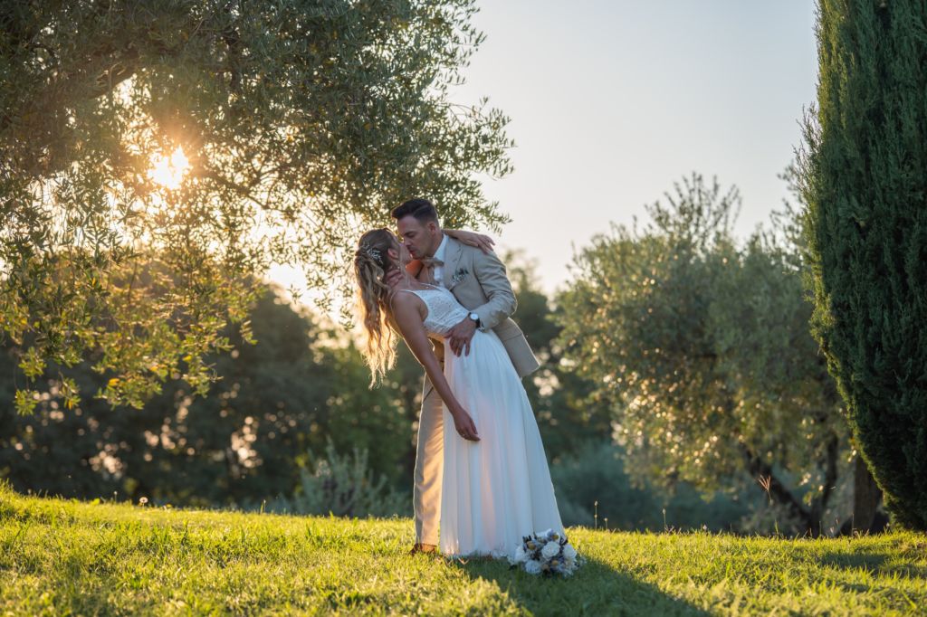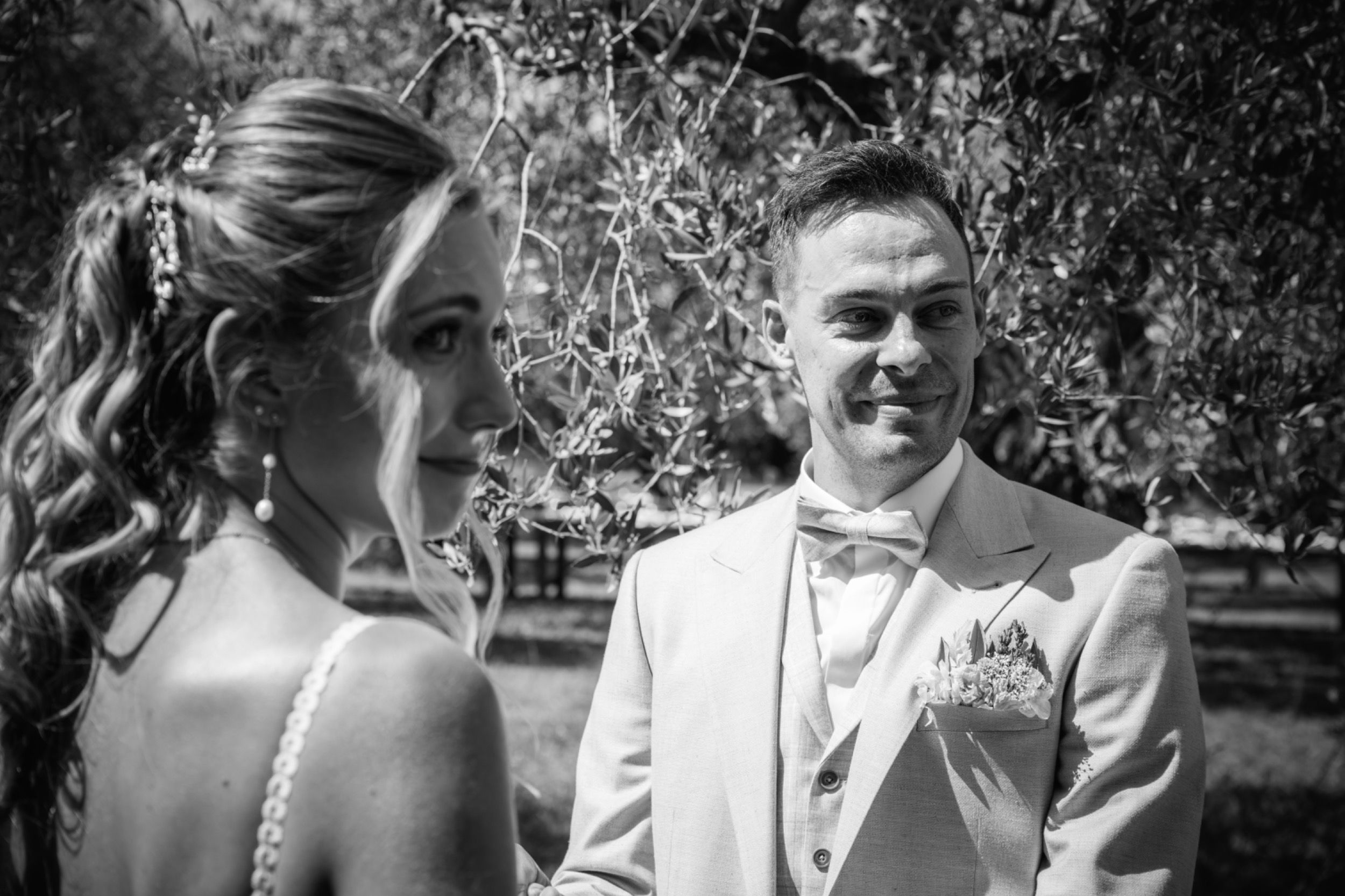 Nach dem Ankleiden ging es hinaus zur freien Trauung – und viel wärmer hätte es an diesem Tag wohl kaum sein können. Zum Glück hatte die Hochzeitsplanerin vorgesorgt: Auf allen Plätzen lagen kleine Sonnenschirmchen und Fächer bereit, die für eine willkommene Abkühlung sorgten.